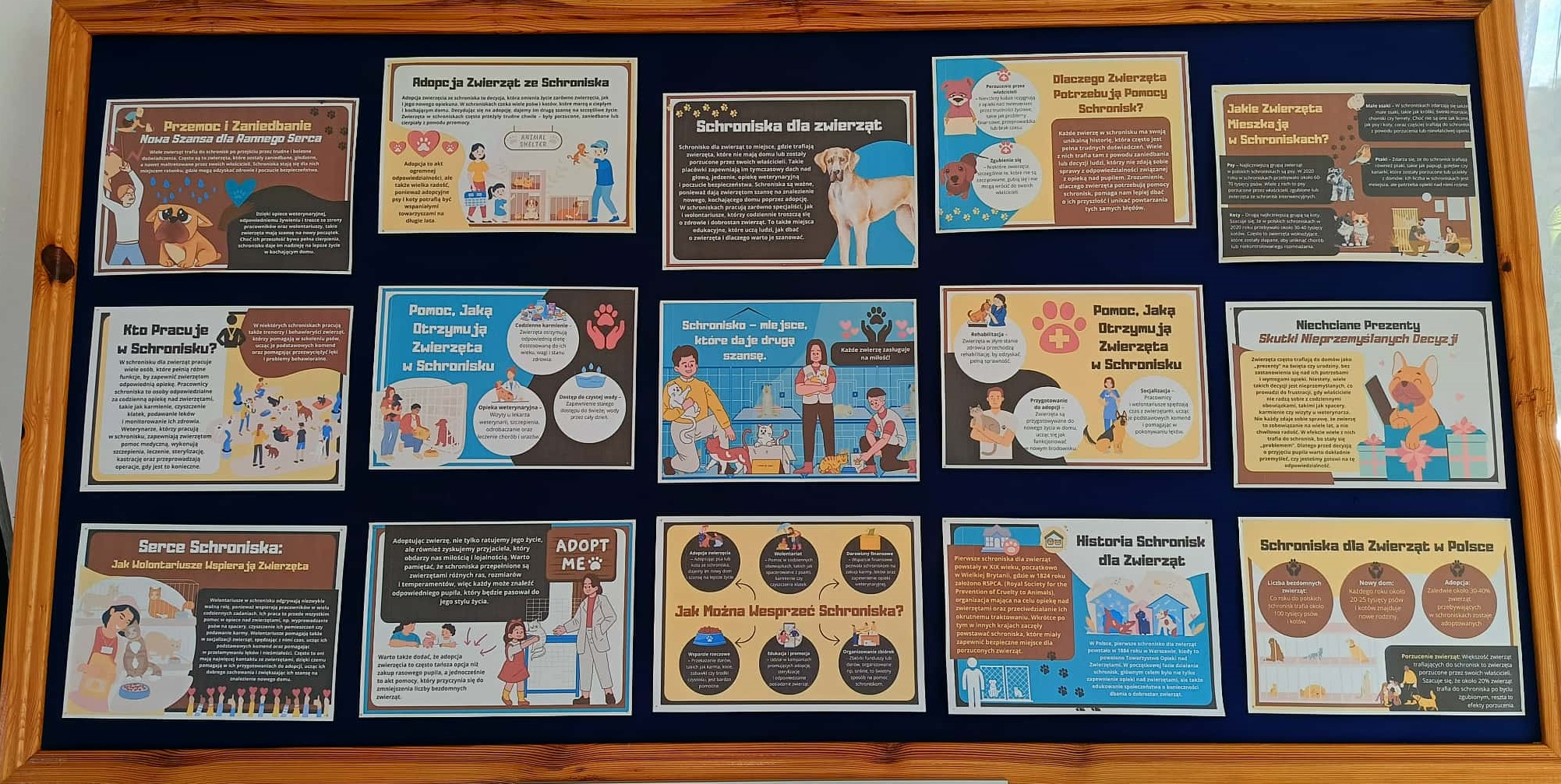W naszej szkole obchodzono „Październik – miesiąc dobroci dla zwierząt”, którego celem było uwrażliwienie uczniów na potrzeby zwierząt i promowanie odpowiedzialnej opieki. W ramach działań przygotowano gazetkę szkolną pt. „Schroniska dla zwierząt”, która przybliżała uczniom ideę adopcji czworonogów, codzienną pracę wolontariuszy oraz trudności, z jakimi mierzą się schroniska. Kolejnym ważnym elementem obchodów była zbiórka karmy dla podopiecznych Stowarzyszenia Opieki nad Zwierzętami „PODAJ ŁAPĘ” w Biłgoraju. Uczniowie, nauczyciele oraz rodzice aktywnie włączyli się w akcję, przynosząc karmę suchą i mokrą oraz inne potrzebne artykuły.