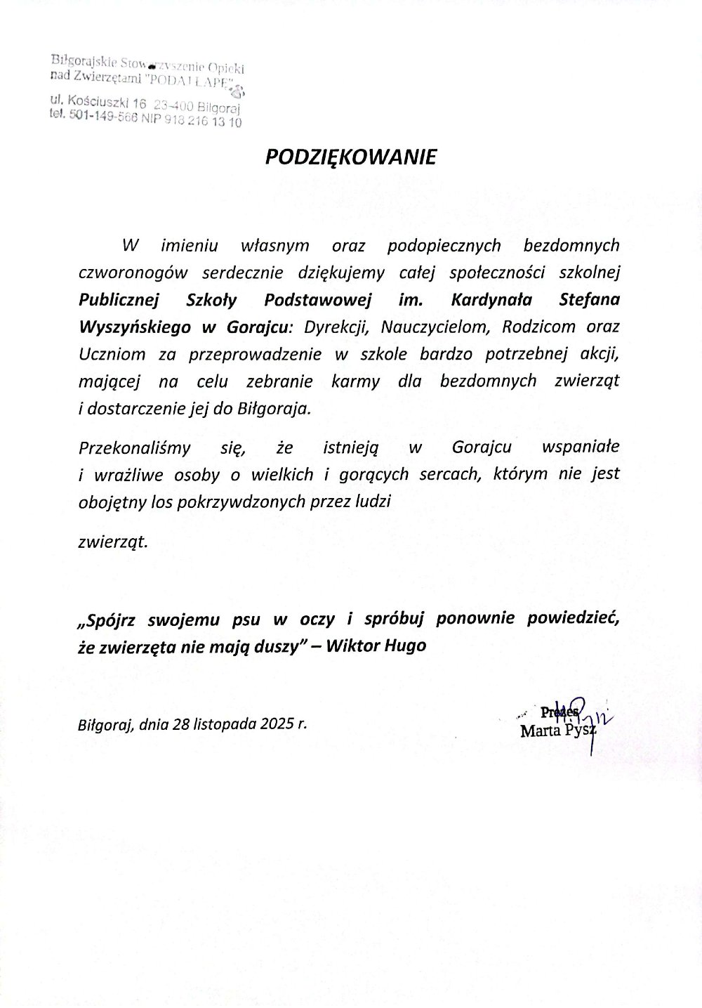 Po zakończeniu zbiórki zebrana karma została przekazana przedstawicielom Stowarzyszenia „PODAJ ŁAPĘ”. Organizacja z wdzięcznością przyjęła dary, podkreślając, że każde wsparcie pomaga im w codziennej opiece nad zwierzętami potrzebującymi pomocy. Szkoła otrzymała również pisemne podziękowanie, które stanowi miły dowód uznania za okazane serce i chęć niesienia pomocy.